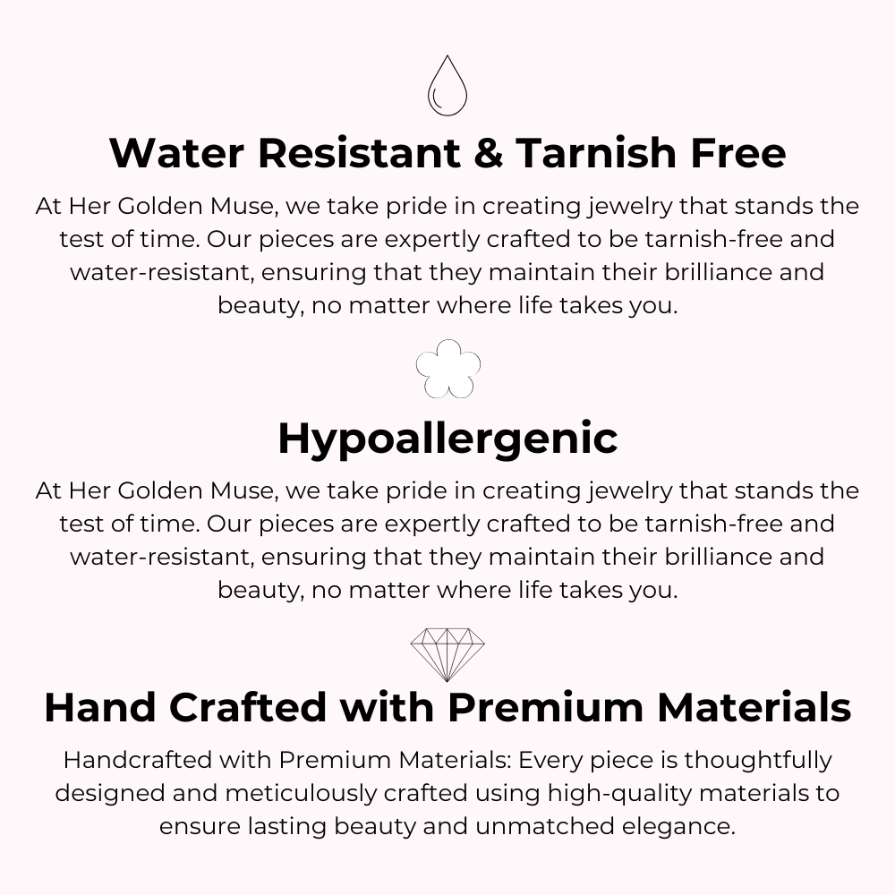 At Her Golden Muse, our mission is to redefine everyday luxury with timeless, handcrafted jewelry that’s as enduring as the women who wear it. We create tarnish- and water-resistant pieces using premium, hand-sourced materials, including real 18k gold and white gold plating. Our jewelry is designed with care, free of harmful chemicals and lead, ensuring beauty and safety.